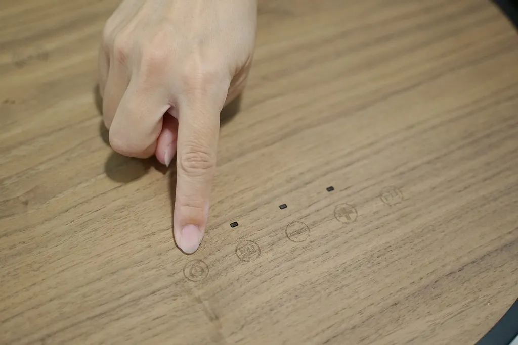 Music Table Pro 高階藍芽音響桌的桌面上使用高級質感雷射雕刻木質觸控按紐以及燈光顯示